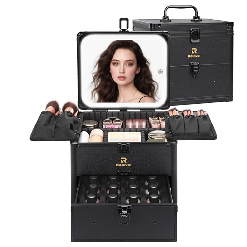 Relavel メイクアップバッグは、LEDミラー付きの2層構造で、コスメティックトレインケースとして旅行やメイクアップアーティストに最適です。調節可能な仕切りとネイルポリッシュオーガナイザーが付き、女性に嬉しいブラックデザイン。