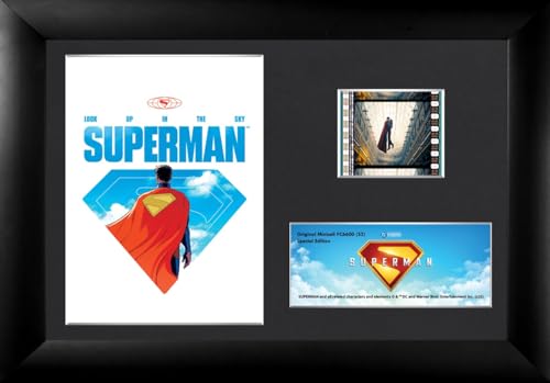 FILMCELLS DCコミックス – スーパーマン (2025) のミニセルは、7インチ x 5インチのデスクトッププレゼンテーションで、イーゼルスタンドと35mmフィルムクリップが付属。公式ライセンス商品。
