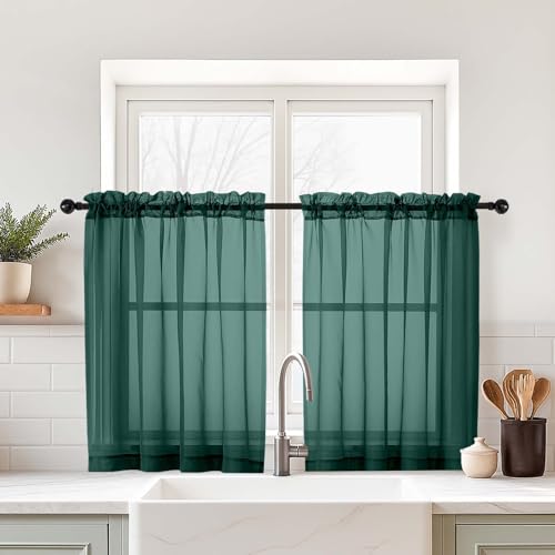 Ebestoのグリーンスモールシアーカーテン、ティアスタイル、24インチ丈、ハンターグリーン色。リビングやバスルームに最適で、ライトフィルター効果あり。デュアルロッドポケット付き、サイズは2枚入りで42W×24Lインチ。