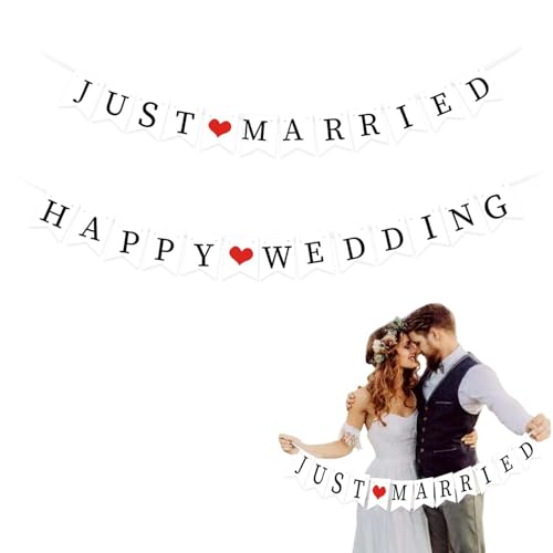 LIKENNY 結婚式用ガーランド 2点セットには「Happy Wedding」と「Just Married」の2種類が含まれ、ウェルカムスペースやパーティーの装飾に最適。リボン付きで、誕生日や記念日にも使えるお祝いアイテムです。