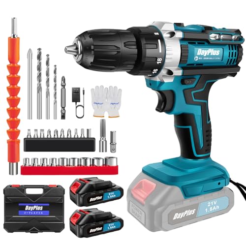 DayPlus 電動ドライバーは最大45N.mのトルクを持ち、21Vでマキタ18Vバッテリー互換。バッテリー2個付、2段変速0-400RPM/0-1400RPM、LEDライト、安全ロック、正逆転切替。DIYや家庭用に最適。