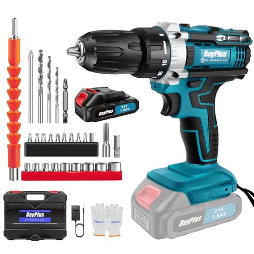 DayPlus 電動ドライバー 電動ドリル 最大45N.m 21V/マキタ対応18Vバッテリー互換 バッテリー1個付き 2段変速0-400RPM/0-1400RPM LEDライト付き 安全ロック 正逆転切替 電動工具セット 電動ドライバー ビット DIY家具組み立て/木工用/家庭用小型/軽量 日本語説明書付き 青の製品情報