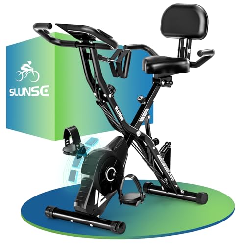 SLUNSEエアロバイクは家庭用静音フィットネスバイクで、5機能・16段階負荷調節が可能。LCDモニターやタブレットトレイ付きで、折りたたみ式でコンパクト収納。耐荷重160kg、日本語説明書付き。