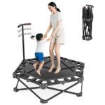 Infinity8の折りたたみ式トランポリンは、静音設計で組立不要。全鋼構造で高弾力、手すり付き。3段階調節可能で、大人から子供まで利用可。耐荷重150kg、家庭用、収納便利、スペースを節約、高耐久性。