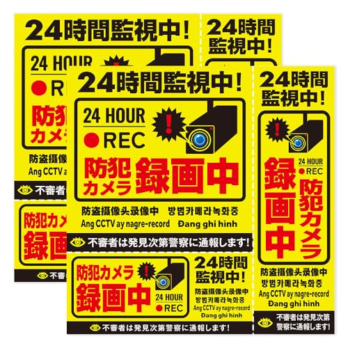 耐光・耐水・耐候性の防犯カメラ作動中ステッカー。反射効果あり、屋外使用に最適。家庭用や車に対応し、6カ国語に対応した防犯シールセット。