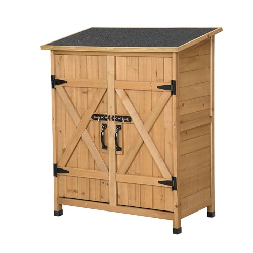 brncigo 物置き 木製 収納庫 観音扉 ガーデニング用品 小屋 戸外収納庫 大型 屋外物置 棚 大型 ドア ベランダ 物置き 屋外収納 ガーデニング ウッド 園芸用品 庭 倉庫 DIY 頑丈 (ナチュラル-アスファルト防水付き)の高価買取