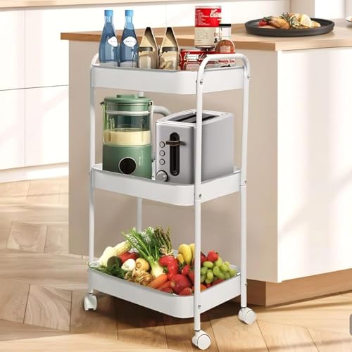 キャスター付きのスリムキッチンワゴン。オール合金構造で防錆性に優れ、狭いスペースにぴったり。3段または4段の収納棚を備え、調味料やペットボトルの整理に最適です。