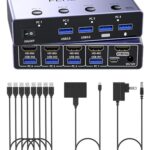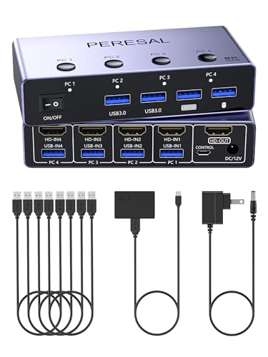 4台のPCを1台のモニターで共有できるKVMスイッチを使用すると便利です。これにより、余分なモニターを省き、効率的に作業ができます。USBポートや音声出力機能付きの製品もあります。