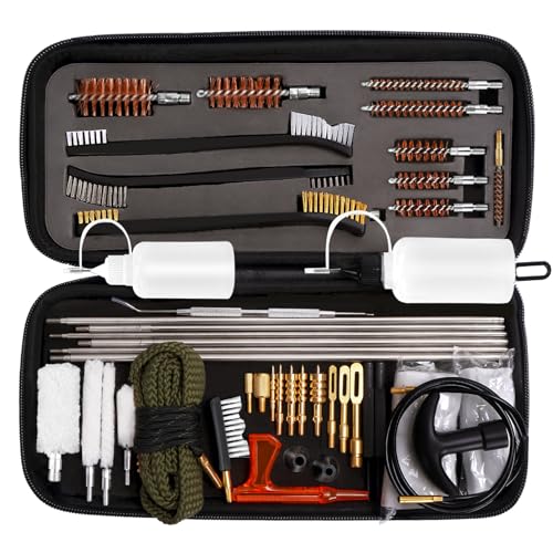 FOCUHUNTER 45セット ガンクリーニングキットは、12GA対応の多機能パッケージ。真鍮製ブラシ、オイルボトル、ロープブラシ、ステンレス鋼ロッドなどが含まれ、軽量で便利。ハンドガン、ライフル、ショットガン対応。