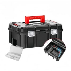 AMG製のPP製工具箱は、シンプルで軽量のブラックデザイン。持ち運びや保管に最適で、耐衝撃性に優れています。ブロックカットスポンジ付き、サイズは25×21×7㎝。