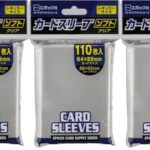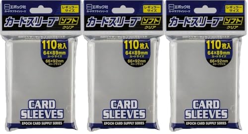 エポック社のカードスリーブ3個セットです。サイズは66×92mm、対応するカードは64×89mm。110枚入りで、ソフトタイプの厚さは0.05mm。トレーディングカード用の最適なサプライです。