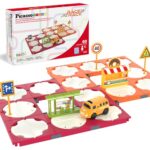 PicassoTilesの60ピースレースカー&トラックビルダーセット。回転式リバーシブルレーストラックやスクールバスおもちゃを含む、STEM学習に最適な組み立てプレイセット。対象年齢3歳以上。