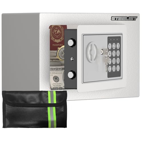 STEELISTの電子ミニ金庫は、家庭用やホテルに最適な小型金庫です。電子テンキー式で、子供用や学生用にも対応。壁付けも可能で、緊急キー2本付き、耐火袋も付属。日本語の説明書が含まれています(白)。
