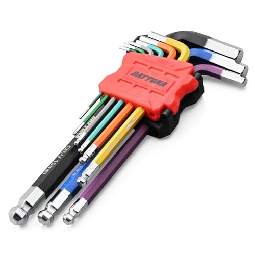 デイトナの六角レンチセットは9本組で、サイズは1.5~10.0mm。ボールポイント設計のL字型で、マルチカラーのデザインが特徴です。