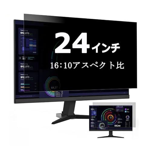 24インチ16:10用の覗き見防止フィルター。PCモニターに最適で、ブルーライトカットやアンチグレア機能も搭載。両面使用可能で反射防止、取り外しも簡単です。
