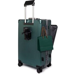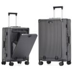 SKYFLYのMサイズスーツケースは、軽量で多機能。100%PC材製、USBポート、TSAロック、静音キャスター付き。フロントオープン、耐衝撃設計、カップホルダーも完備。60Lで3-5泊の旅行に最適。