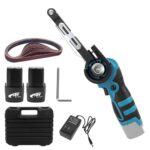 bumxcaの電動ミニベルトグラインダーは充電式で、6500RPMの純銅モーターを搭載。180°角度調整可能、小型軽量で片手操作が可能です。替えベルト10本やバッテリー2個、収納ケース付き。DIYや金属加工に最適。
