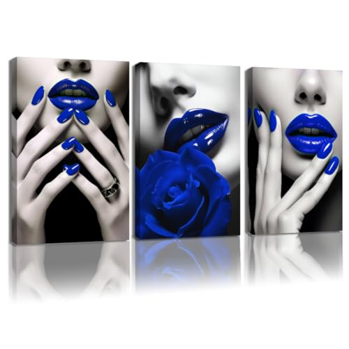 CCWORKERRYリップスキャンバスウォールアートは、女性の唇をテーマにした3ピースセットです。黒と青のデザインで、メイクアップルームやビューティーサロンに最適です。各ピースのサイズは幅11 x 長さ14インチです。