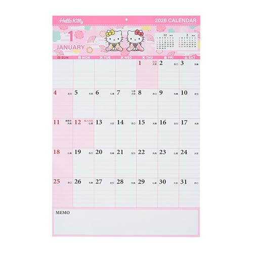 サンリオの2026年ハローキティ書き込みカレンダー。可愛らしいデザインで、壁掛けタイプ。日付やメモを書き込めるスペースもあり、実用性と楽しさを兼ね備えたアイテムです。