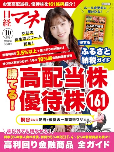 日経マネー2025年10月号の特集は「勝てる!高配当株 優待株161」。表紙には女優の橋本環奈が登場し、特集に関連する投資情報が満載です。最新の投資トレンドを抑えた内容となっています。