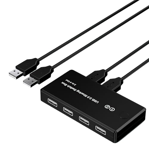 USB切替器KVMスイッチは、2台のPCを4ポートで接続し、プリンタ、マウス、キーボードなどを手動で切り替え可能。1.5mのUSBケーブルが2本付属。