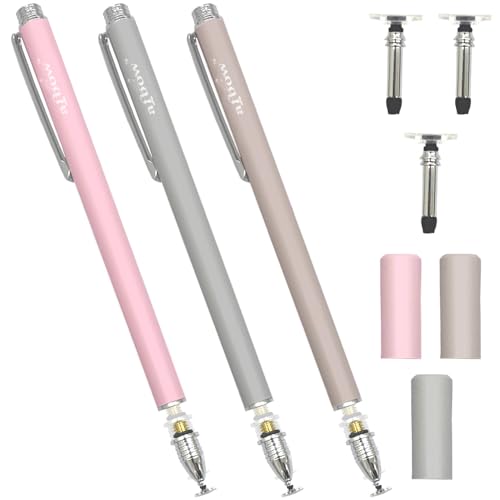 aibowタッチペンは、充電不要でiPad、iPhone、Android、Switchなどに対応。3本のスタイラスペン(キャップ付)と交換用ディスク3個がセット。くすみカラーのデザインが魅力的。