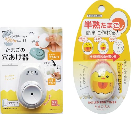 ゆで卵穴あけ器とたまご名人エッグタイマーのセットです。穴あけ器で卵に小さな穴を開け、エッグタイマーを使って理想のゆで具合を簡単に確認できます。便利で美味しいゆで卵作りに最適なアイテムです。