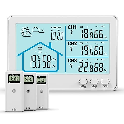 Timloonのデジタル温湿度計は、室内・室外で使用できるワイヤレスモデル。3つのセンサーで外気の温湿度を測定し、天気予報や気圧表示も可能。大画面LCDにバックライト、快適レベルと傾向図表示もあり、置き掛け両用です。
