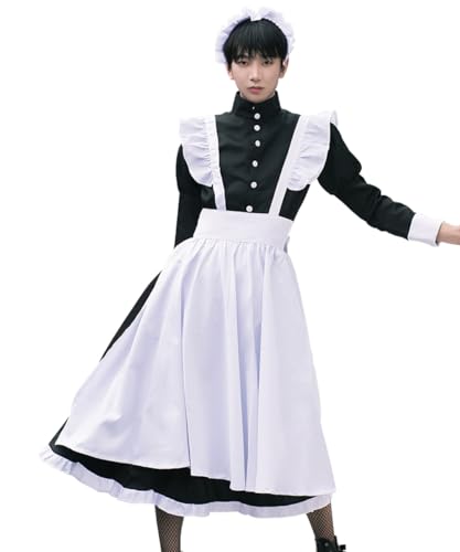 NIUKACOS メンズ メイド服 5点セット(ドレス、エプロン、靴下、カチューシャ、リボン)。大人用コスプレ衣装としてハロウィンや撮影会、イベントに最適なXLサイズです。