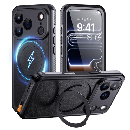 Lanhiem iPhone 17 Pro用ケースはIP68防水規格で、隠しスタンド、顔認証対応、耐衝撃、滑り止め、防指紋、防塵、防雪機能を備え、水中撮影も可能。マグネット搭載、ストラップ付きで、全面保護の薄型ブラックカバーです。