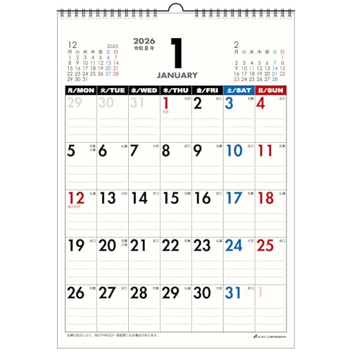 アクティブコーポレーションの2026年カレンダー(壁掛け、月曜始まり、A4サイズ)の26ACL-54は、1月始まりで、計画がしやすい週間レイアウトが特徴です。シンプルで使いやすいデザインです。