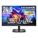 IODATAの24.5インチGigaCrystaゲーミングモニターは、240Hzのリフレッシュレートと1msの応答速度を実現。HDRとAdaptiveSyncに対応し、HFSパネルを搭載。日本製で無輝点保証付き。接続端子はHDMI/DisplayPort、VESAマウント可、チルト角調整も可能。