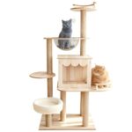 YASICAのキャットタワーは木製でスリムなデザイン。透明ボウルや宇宙船付き、多頭飼いや大型猫向け。運動不足解消に最適で、頑丈で安定感あり。サイズ60×40×132cm、原木色。