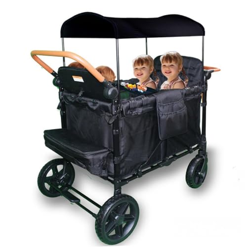 キャリーワゴンは屋根付きのストローラーワゴンで、2人乗り対応。折りたたみ可で持ち運び楽々、レインカバー付き。1歳から7歳まで使用可能で、組立不要の大型アウトドアワゴン。
