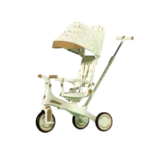 子供用三輪車 7in1は、6ヶ月から6歳まで使用可能。折りたたみ式で手押し棒付き、座面が回転し超軽量。ホワイトカラーに日よけ付きのキイロミドリ。誕生日プレゼントに最適!