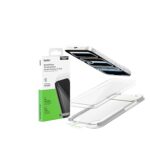 BelkinのiPhone17 Pro用強化ガラス保護フィルム。0.33mmの薄さで指紋・飛散防止、抗菌加工を施し、日本AGC旭硝子製。取り付けフレームガイド付きで、2枚入り。