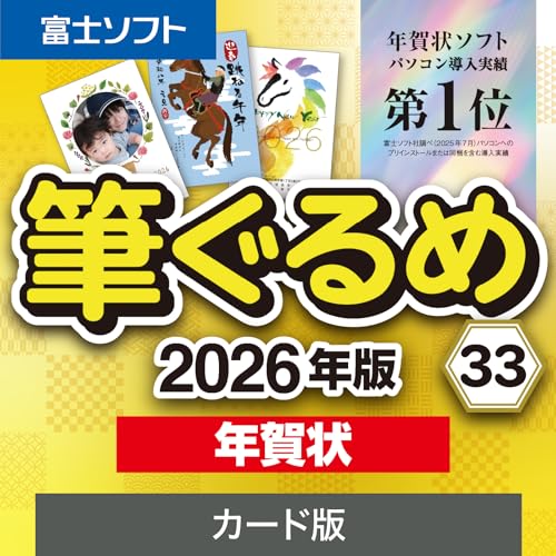 ソースネクストの「筆ぐるめ 33 2026年版」は、Windows対応のはがき作成ソフトです。豊富なデザインテンプレートや簡単な操作で、年賀状作成をサポートします。