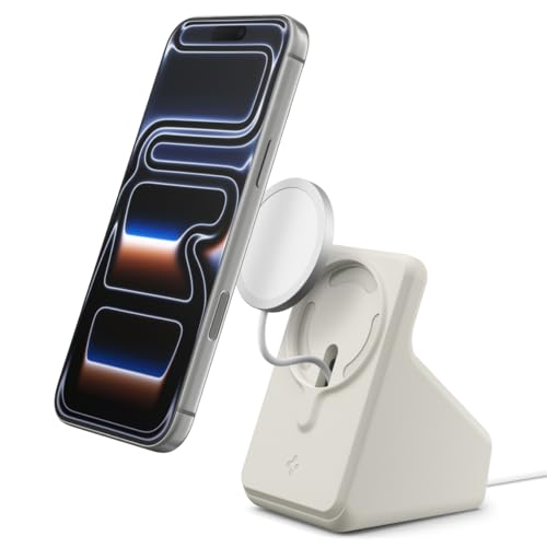 SpigenのiPhone MagSafe充電スタンド(2024年対応)は、卓上スタンドで充電ケーブルを収納可能。シンプルなデザインで、マグフィットのデュン・ベージュ色が特徴です。