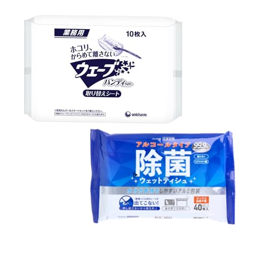 業務用ウェーブハンディワイパー取り替えシートと清潔習慣除菌ウエットティシュの2点セット。オフィス清掃や衛生ケアに最適で、手軽に消毒と清掃が行えます。効果的に清潔を保ちます。