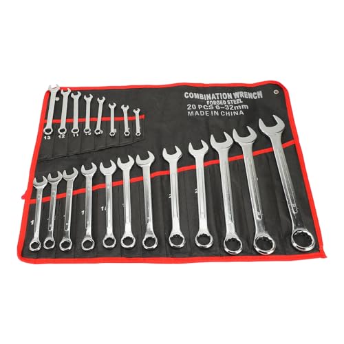 Focketyの20本スパナレンチセットは、6-32mmおよび0.24-1.26インチサイズに対応。メトリックとSAE両方に対応し、ローリングポーチ付きで持ち運び便利。耐久性のあるCrバナジウム鋼製。