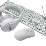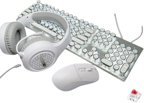 AZIEBAYのメカニカルゲーミングキーボード&マウスセットは、レトロスチームパンクデザインで104キー青軸、アンチゴースト対応。LEDバックライト、USB接続、耐久性のあるメタルパネル、丸型キーキャップ、ピンクカラーの魅力的な一品です。