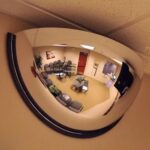 屋外用のカーブミラーで、1/4凸面デザイン。接着タイプで設置簡単。工場や駐車場、ガレージに最適。事故防止や防犯に役立つ半球状の広角レンズ。直径50cmのサイズ。