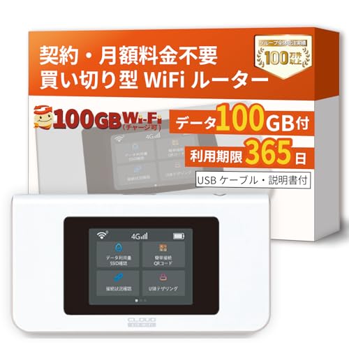 100GB-WiFi(チャージ可)はリユース品のモバイルWiFiルーターで、国内専用。利用可能残数300日以上、データ残量65GB以上保証。リチャージ可能で月額費用無し、追加データチャージ機能付き。キャンプや車での使用にも対応。