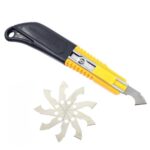 kaofishのユーティリティナイフは、アクリルシートやプラスチックシートのカッティングに最適。壁掛け式で、ハンドル1個と刃13枚付き。DIYに便利な小型交換刃仕様(黄色)。