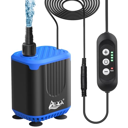 AQQAの小型水中ポンプは、4段階の流量調節と給餌モード機能を備え、吐出量2200L/H、最大揚程2.2M。静音設計でIP68防水。水槽や水耕栽培、噴水用に最適。