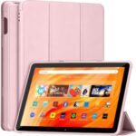 2023年モデルのFire HD 10(13世代)用カバー。三つ折りスタンド付きで軽量・薄型。オートスリープ機能対応、耐衝撃性も備えたピンク色のケースです。
