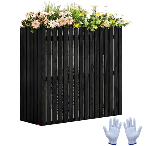 エアコン室外機カバー(木製)は、屋外の目隠しフェンスとしても人気。サイズは85x35x80cm(33x14x31インチ)で、ブラックカラー。耐久性があり、外観を整えるデザインです。