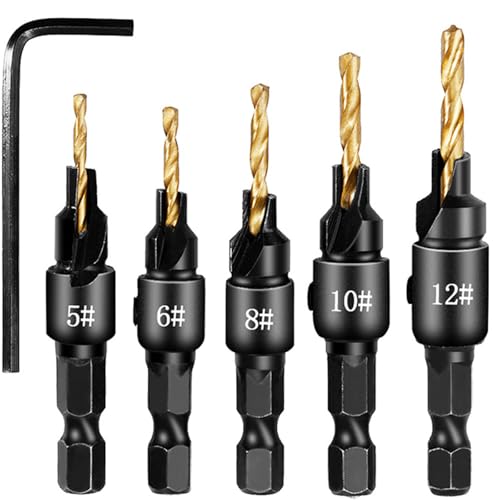 Mirhuaの皿穴ドリルビットは、木工用の六角軸皿取錐で、5#、6#、8#、10#、12#の5本セット。木材への穴あけに最適で、L字型レンチも付属しています。ゴールドカラー。
