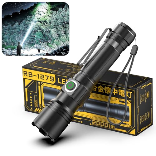 強力懐中電灯RB-1279は、超高輝度LED、5モード調光、IPX6防水、耐衝撃、ズーム機能を兼ね備え、最大照射距離500m。Type-C充電・電池式、クリップ付きで便利。防災や夜釣り、登山に最適。