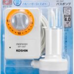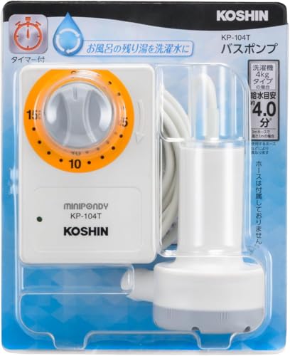 家庭用バスポンプ AC-100V KP-104Tは、最大吐出量14L/分で、15分タイマー機能付き。3mホース、内径15mmの水道ホースに対応し、残り湯を洗濯機に使用可。
